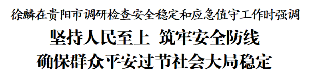 2025年12月31日,省委书记徐麟在贵阳市白云区、观山湖区调研检查岁末年初安全稳定和应急值守工作,代表省委、省政府向节日期间坚守岗位的工作者、劳动者致以诚挚问候。他强调,要深入学习贯彻习近平总书记关于更好统筹发展和安全的重要指示精神,全面落实中办、国办关于做好2026年元旦春节期间有关工作的通知要求,坚持人民至上,筑牢安全防线,确保群众平安过节、社会大局稳定。